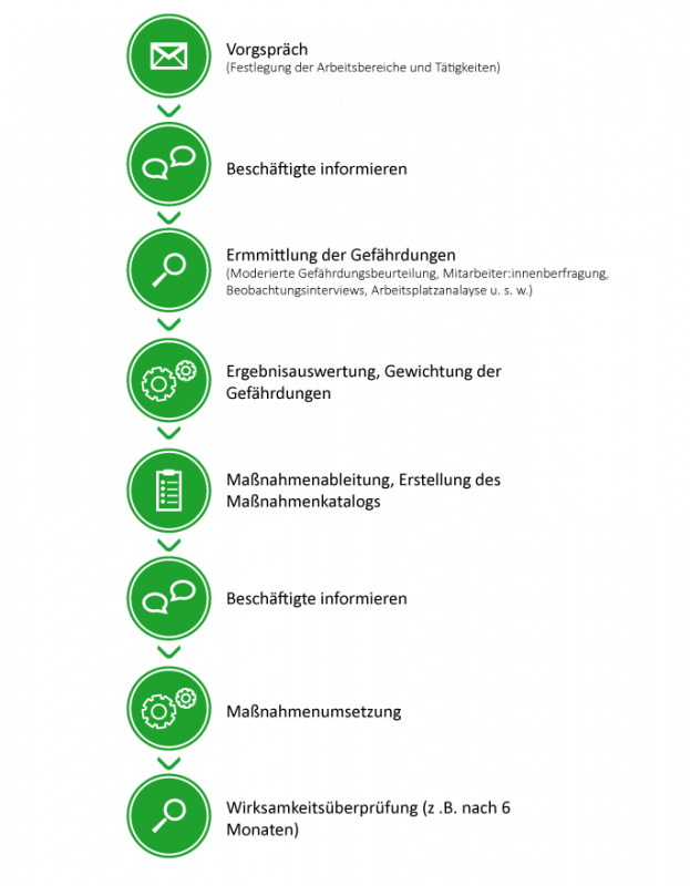Ermittlung der Gefährdung (z. B. Mitarbeiter:innenbefragungen, Interviews, Analyseworkshops, Begehung der Arbeitsplätze)